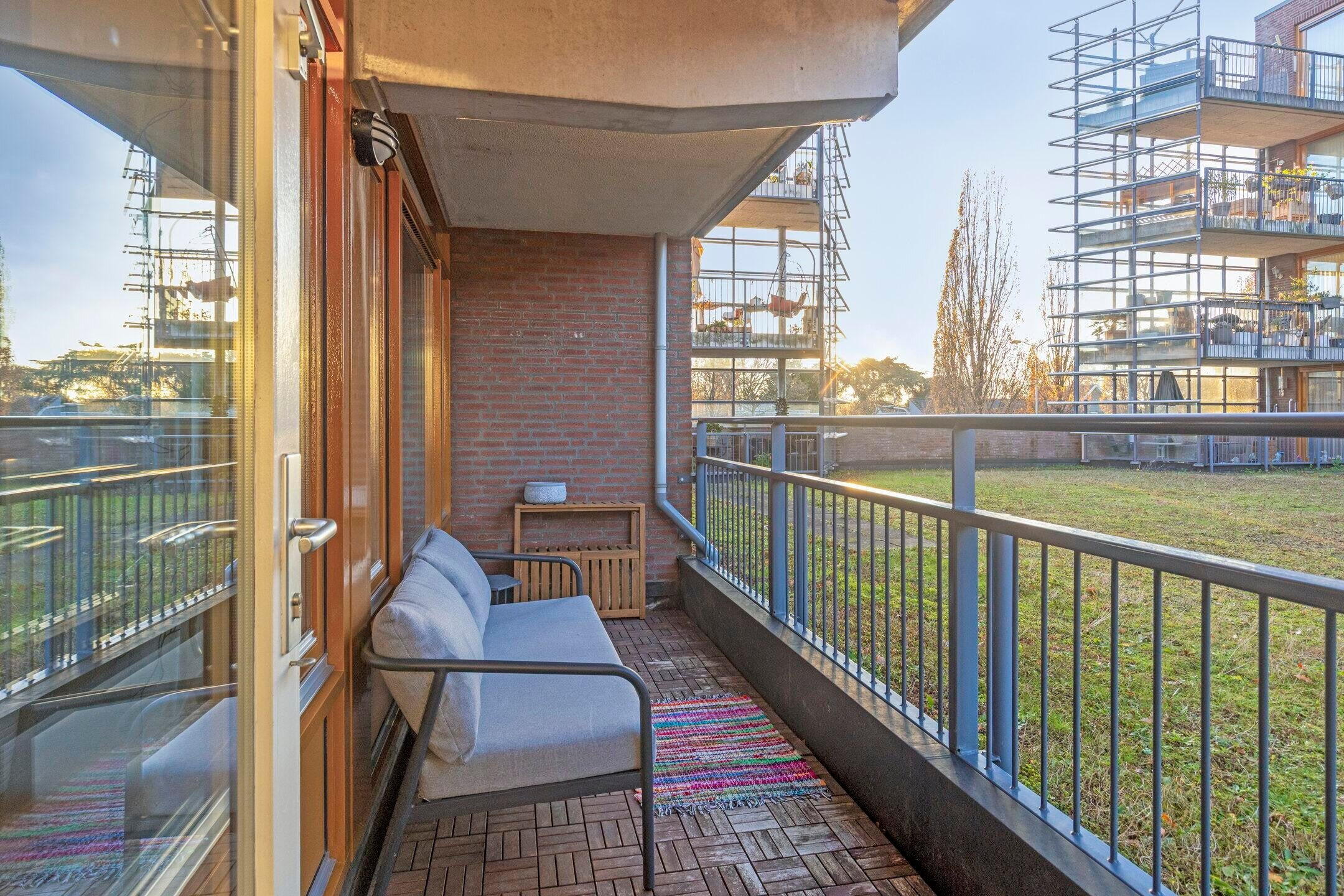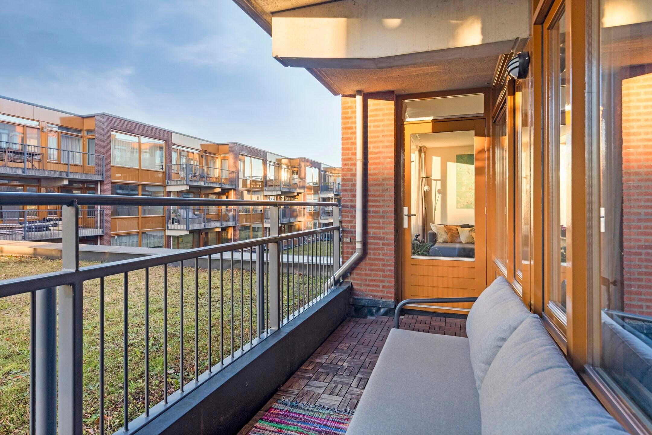 Vanuit de woonkamer stap je het balkon op: een heerlijke plek om even buiten te zitten en te genieten van het groene uitzicht. Een rustige setting waar je echt tot ontspanning komt.