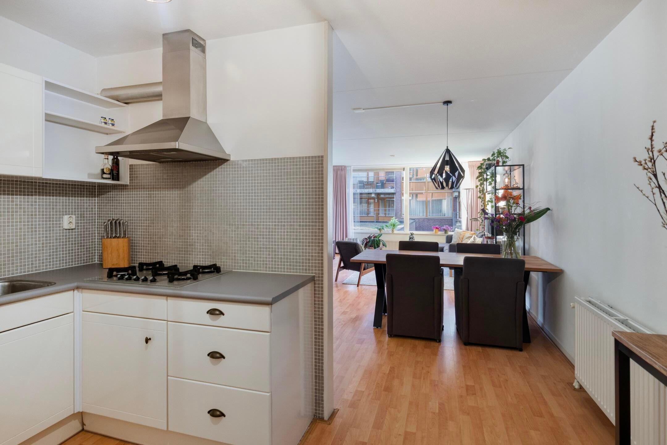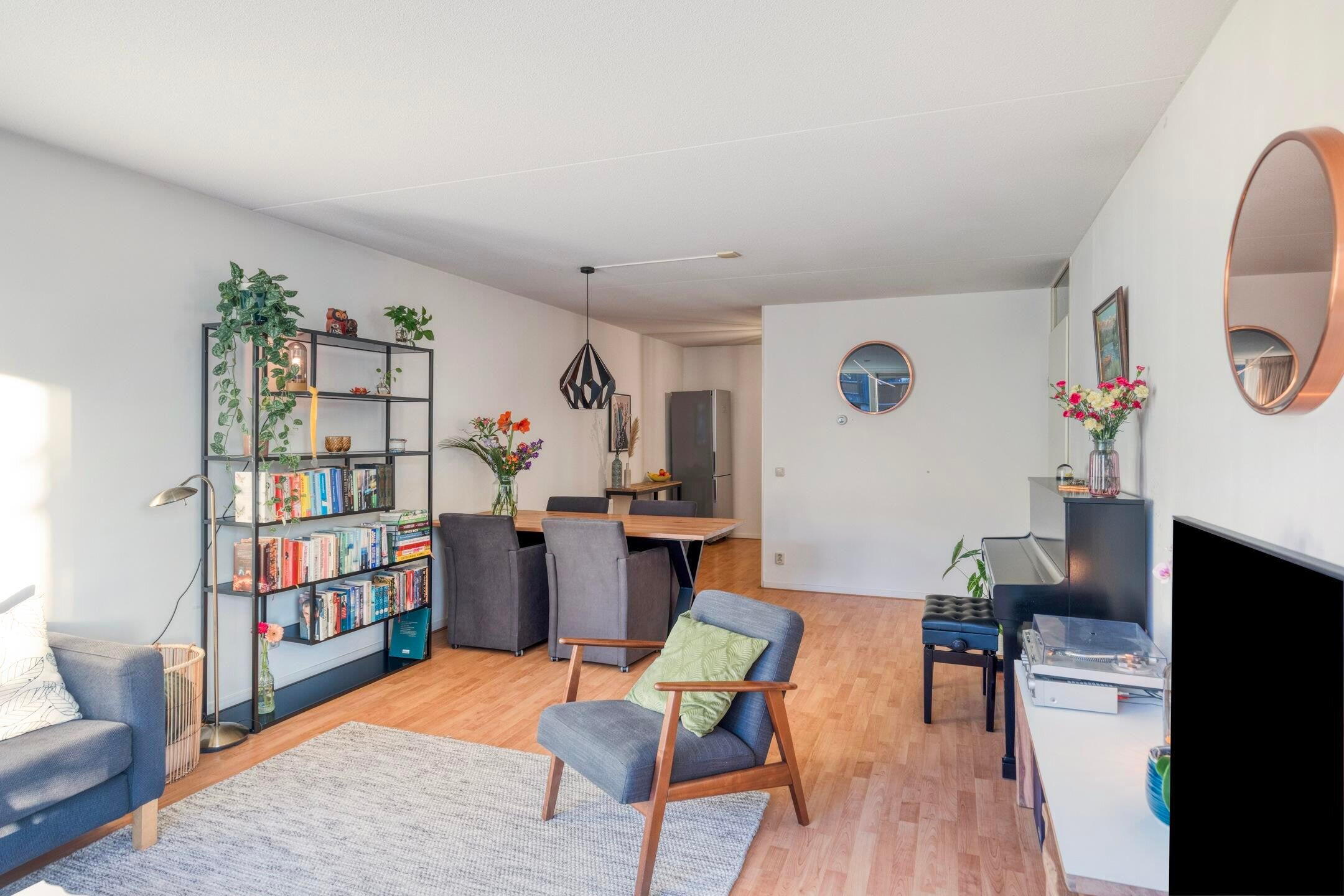 De woonkamer is een fijne leefruimte met een prettige indeling. Dankzij de slimme opzet creëer je hier moeiteloos een gezellige zithoek én een comfortabele eethoek. De halfopen keuken sluit hier mooi op aan, waardoor koken en samenzijn vanzelf samengaan.